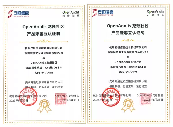 自 2023 年 6 月,龙蜥社区联合 23 家单位共同发起龙蜥社区安全联盟(OASA,OpenAnolis Security Alliance)以来,多家企业产品已完成与龙蜥操作系统安全适配认证。其中安恒信息产品明御终端安全级防病毒系统与安恒网站卫士网页防篡改系产品,与 Anolis OS 完成了在x86、AArch64 两个不同架构下的相互兼容性测试认证,意味着 Anolis OS 的网络安全防护能力能够与安恒信息卓越安全防范机制深度融合,为用户提供更可靠、更安全、更便利的龙蜥安全解决方案。