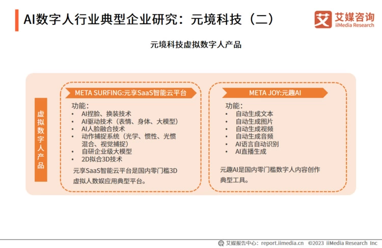2023年4月,元境科技在“MetaSurfing-元享智能云平台”产品发布会上提出了AIGC+X的产品体系模式,产品在元享平台的基础上以AIGC技术为核心,降低虚拟数字人创作门槛,提高数字人创作效率。元享SaaS云平台与元趣AI作为元境科技的主要数字人产品,突破了现有传统虚拟数字人生产制作流程,实现了超高精度渲染技术及生成效果,为客户提供低成本数字助手。