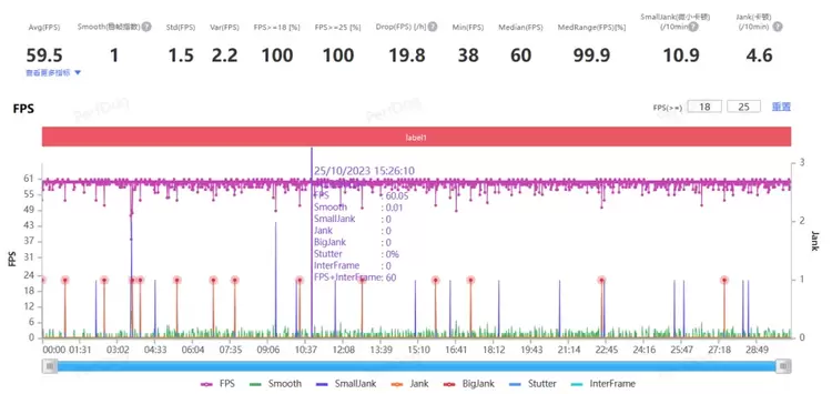 被称为性能测试软件的原神,已经彻底被第三代骁龙 8 成功拿下,30 分钟虚弥城跑图,默认极高画质,跑出了平均 59.6 帧的帧率,全程没掉帧: