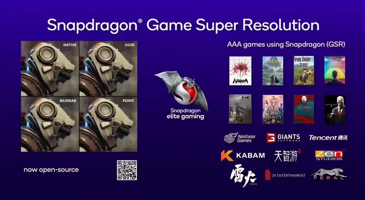 关键这还没完,我注意到高通还推出了一个类似英伟达 DLSS、AMD FSR 的骁龙游戏超级分辨率,最高能把手游超分到 8K。