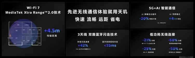在连接方面,天玑9300支持Wi-Fi 7,最高理论峰值速率可达6.5Gbps,同时搭载联发科特有的Wi-Fi 7增强技术。MediaTek Xtra Range 2.0 技术让Wi-Fi 7超广覆盖,并且可以提升设备间传输数据的速度和抗干扰的能力。此外,天玑9300最高还可支持3个蓝牙天线,结合特有双路蓝牙闪连技术,让蓝牙设备的匹配速度更快,音频时延超低。