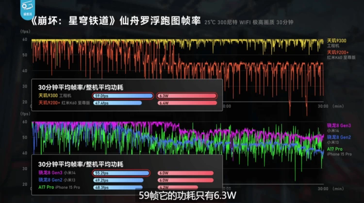 随后,极客湾又对《崩坏:星穹铁道》进行了测试,结果令人震惊!在相同的755P分辨率下,天玑9300以59帧的成绩完成了崩铁最高画质的测试,让人难以置信!相较于8G3的55帧,这个59帧的成绩实在是有点离谱了。同时功耗也仅为6.3W,并没有比8G3的55帧功耗高出太多。这意味着只要手机的散热性能稍好一些,就能轻松实现《崩坏:星穹铁道》满帧运行,这在以前是不可想象的。毫无疑问,天玑9300全大核CPU架构和强悍GPU带来的性能和能效突破,将为手机玩家带来更加极致的游戏体验。