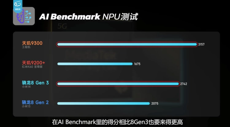 除了CPU和GPU外,此次天玑9300还展现了一个格外引人注目的成果,那就是APU(就是NPU)。极客湾这次还专门测试了天玑9300的AI-Benchmark成绩,其达到了3157的超高分数,与8G3的2742分相比,可以说是遥遥领先了!