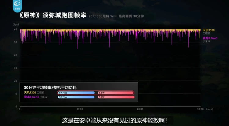 CPU、GPU加上APU三杀8G3,天玑9300彻底坐稳安卓最强旗舰芯片地位,那这么强的芯片,跑游戏的时候表现又如何呢?在《原神》最高画质设置下跑30分钟,这台工程机用更低的功耗跑出了比8G3更高的帧率,平均帧率59.7帧,功耗5.5W,这是安卓端前所未有的《原神》能效!同时也意味着,以后即使是非游戏手机,搭载天玑9300也能够毫无压力地以60帧的流畅度畅玩《原神》。