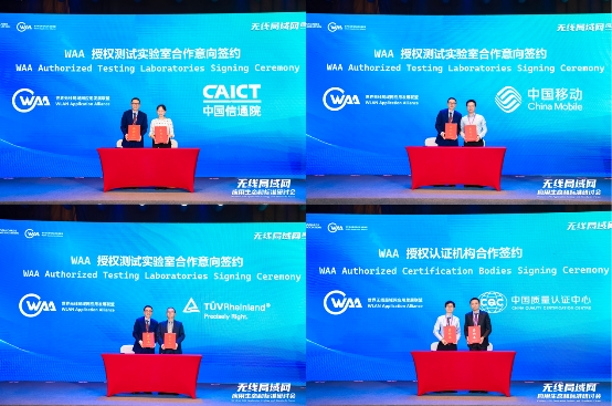 以技术规范为基础,以联盟管理文件为依据,为了在园区场景和家庭场景使用的WLAN产品无线网络性能及体验等特性展开测试评价和产品认证方面和授权机构和实验室展开合作,WAA联盟和多方签订了MOU,在双方自愿、平等的前提下,基于双方彼此充分信任,通过资源共享、优势互补与业务创新,推动双方业务实现跨越式发展,打造“共创·共享·共担”的可持续合作伙伴关系。WAA 联盟授权测试实验室,包括:中国信息通信研究院、中移(杭州)信息技术有限公司和莱茵检测认证服务(中国)有限公司。WAA 联盟授权认证机构为:中国质量认证中心。