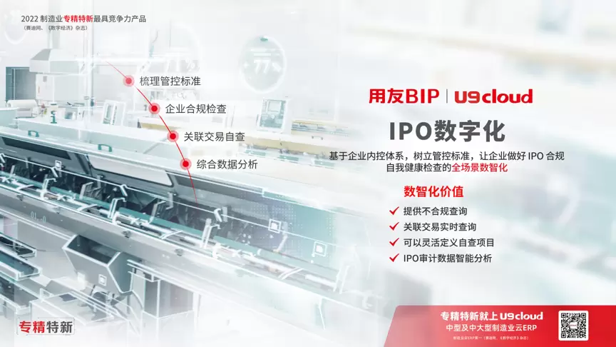 U9 cloud紧跟市场需求,顺势推出IPO助手。它以专精特新IPO场景为切入点,帮助企业建立健全有效的内部控制体系、树立标准、分清权责,从经营管理的角度做数据归集,从安全合规的角度做日志追踪,以更加直观的形式展现企业全貌,助推IPO企业顺利过会,快速登录资本市场。