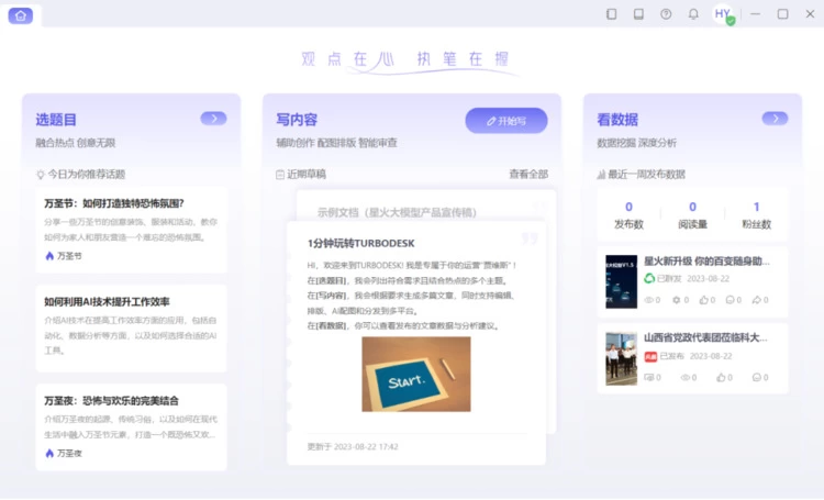 星火内容运营大师是一款集内容创作、配图、编辑、审核、发布、数据分析于一体的全能工具。它能够帮助新闻工作者快速撰写出高质量的新闻报道,同时也能够对发布的内容进行深度分析,为新闻工作者提供精准的数据支持,帮助他们更好地理解读者的需求,优化内容策略。星火内容运营大师还可以结合热点话题自动推荐优质选题,撰写新闻稿件过程中,它还能够融汇用户的私有知识库、整合新闻素材,在使用通用数据库的基础上结合个性的知识库,最大程度还原新闻工作者心中最理想的内容作品。