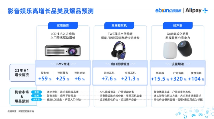 根据阿里巴巴国际站(ICBU)在《消费电子行业采购节行业报告》中的数据显示,耳塞耳机、扬声器和家用音视频产品均实现了50%以上的增长,预计下半年,户外音箱、便携音箱、投影仪等爆品还将迎来大幅增长。