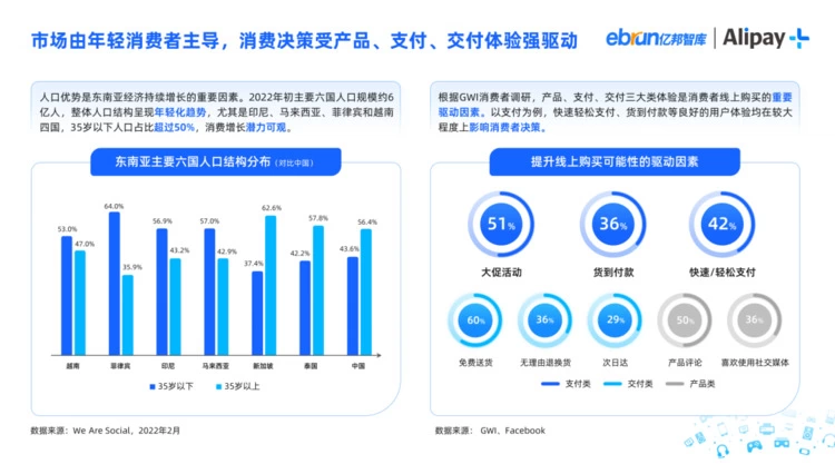 人口红利突出、电商发展迅猛的东南亚市场为影音娱乐新消费品出海贡献了重要增量,近几年东南亚影音娱乐产品市场年均增长均超过其消费电子整体增长,来自年轻消费者群体的喜爱和购买功不可没。东南亚由年轻消费者主导,尤其是印尼、马来西亚、菲律宾和越南四国,35岁以下人口占比超过50%,年轻人群成为消费主力。他们尤其重视产品、支付、交付相关体验,如免费送货在消费者决策因素中占比达到60%,快速/轻松支付和货到付款占比分别达到42%与36%。因此,关注这些方面将有助于商家更好地俘获东南亚消费者的芳心,了解并迎合消费者需求是抓住市场机遇的前提。