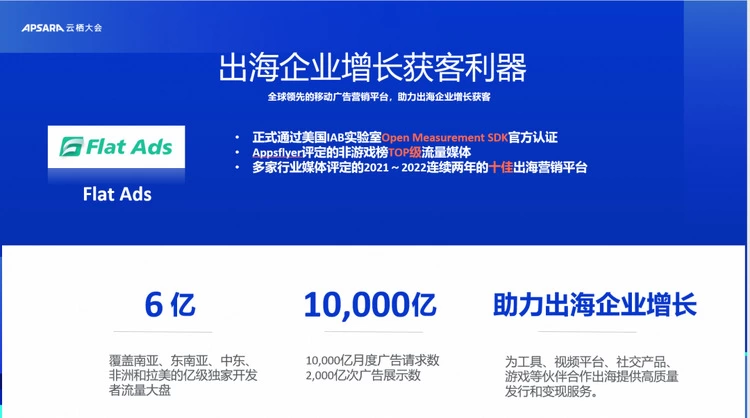 近年来,Flat Ads凭借覆盖印度、东南亚、中东、非洲和拉美的亿级独家开发者大盘和更透明真实的流量,持续为工具、视频平台、社交产品、游戏等伙伴合作出海提供海外买量、发行和变现服务,帮助每一位客户实现量价起飞的目标。据了解,Flat Ads凭借智能营销平台,以灵活多样的广告形态、对接方式、优质海外流量、深耕互动广告,以及易用高效的DSP/SSP平台等优势,帮助客户精准触达目标用户,赢得了迅猛的发展态势和良好的服务口碑。当前,Flat Ads每月的广告请求数已达10000亿次,广告展示数达到2000亿次。同时,Flat Ads还为开发者提供海外App变现服务,海量海外广告资源实现各类广告位变现,丰富全球广告合作,广告收益最大化。