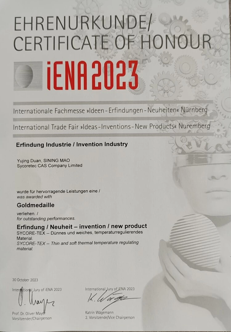 中科海势获奖后,段董在接受媒体采访时讲到,“我很自豪我的祖国——中国能够受邀成为本届纽伦堡国际发明展的主宾国!感谢大家关注来自中国的发明创造!我们中科海势公司也将继续秉承‘科技创新’的发展理念,不断加强研发力量和技术创新,推动 SYCORE - TEX第三代技术拓扑柔凝胶的迭代升级,为中国轻薄保暖调温材料领域带来更多的活力与变革。让科技引领行业,行业温暖世界!”