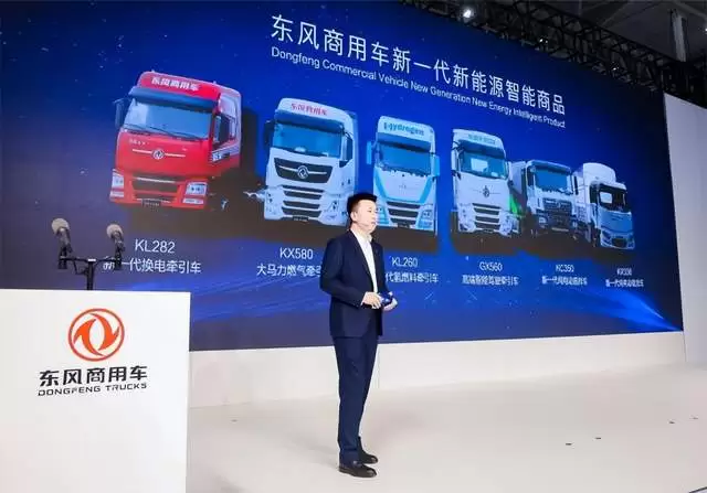 在发布会现场四周,应用于各场景的绿智代表产品也同步静态展出,包括:新一代氢燃料牵引车,匹配东风自主大功率燃料电池系统,可实现行业最大功率、最低能耗、最大动力;东风天龙GX-自主L2+级智能驾驶牵引车,匹配东风自主智能驾驶系统,可靠性、耐久性处于国际领先水平;全新造型、动力升级、能耗更优的新一代KL换电牵引车,五分钟完成换电补能作业,便捷换电带来续航无忧;全新升级的行业最低气耗东风天龙KX大马力燃气车,行业首家采用1350L双气瓶;新一代天锦KR载货车,匹配全新驾驶室、自主电驱动桥、自主上装及电池底置;以及通过专业化底盘和专业化上装的充分协同,为专用作业场景打造的12方KC纯电动搅拌车。