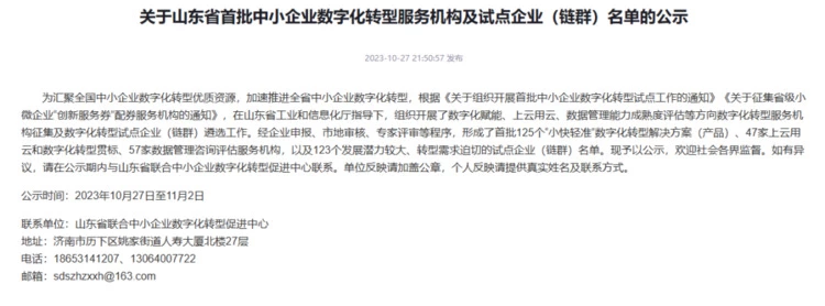此次,数字化转型服务机构征集及数字化转型试点企业(链群)遴选工作,根据《关于组织开展首批中小企业数字化转型试点工作的通知》《关于征集省级小微企业“创新服务券”配券服务机构的通知》要求,在山东省工业和信息化厅指导下开展,经企业申报、市地审核、专家评审等程序,形成了首批125个“小快轻准”数字化转型解决方案(产品)、47家上云用云和数字化转型贯标、57家数据管理咨询评估服务机构,以及123个发展潜力较大、转型需求迫切的试点企业(链群)名单。