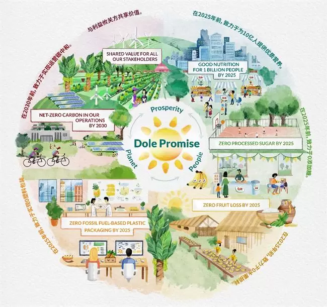 百年都乐始终坚持着绿色可持续发展事业,自2020年6月推出了“Dole Promise都乐使命”,都乐推出自身体系碳中和,为更多人提供高品质的营养,致力于实现多方共赢,减少水果损耗等多项目标,为地球、为环境贡献都乐的一份力量。