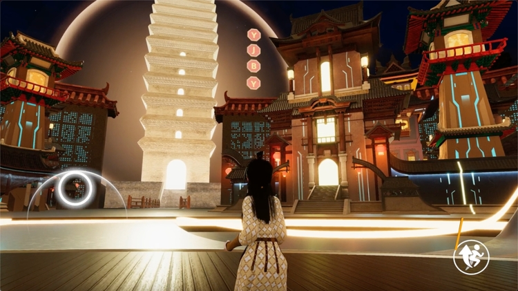 如《宝珠记》元宇宙3D互动空间,故事灵感来源于《太平广记》,双方通过深度挖掘文物背后的故事将文物人格化,结合历史在空间中植入互动体验剧情,再通过3D实时云渲染技术和高清建模来做超高画质的呈现,让文物走出展厅,以更鲜活丰满的姿态与公众见面。游览者以“历史参与者”的身份开启一段“全新的人生体验”。通过金乡县主、仕女和胡人商贾的故事互动,元宇宙空间生动串联彩绘胡人俑、少女俑、骑马狩猎俑等50件文物,以及小雁塔、辋川图、长安108坊等情境,让游览者在探索故事的过程中体验到大唐长安的社会百态、开放包容,引发公众对家国情怀的体悟。