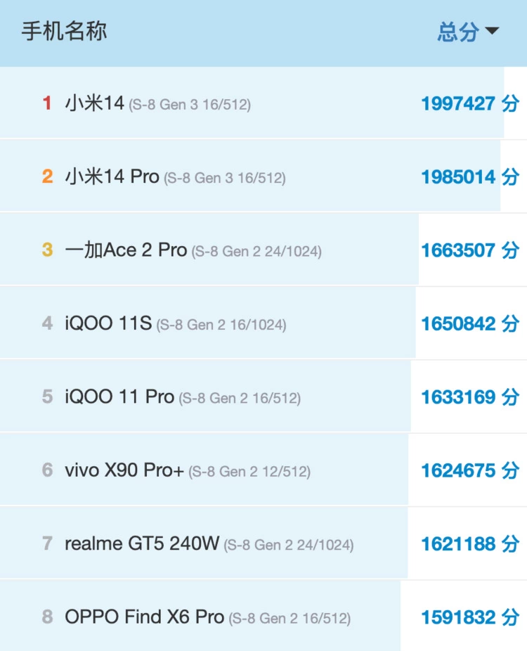 除了最新发布的第三代骁龙 8 手机,前排基本都是第二代骁龙 8 系列手机的身影。