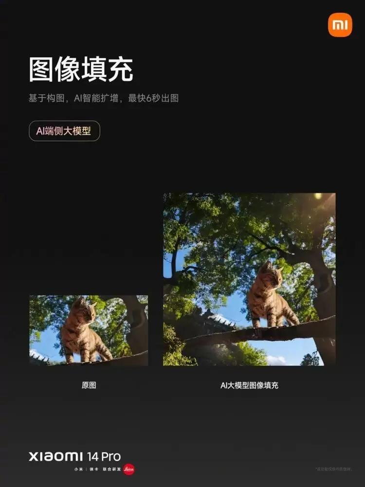 原图是小猫特写,小米 14 系列的端侧 AI 可以直接利用大模型进行扩图,最快 6s 完成。