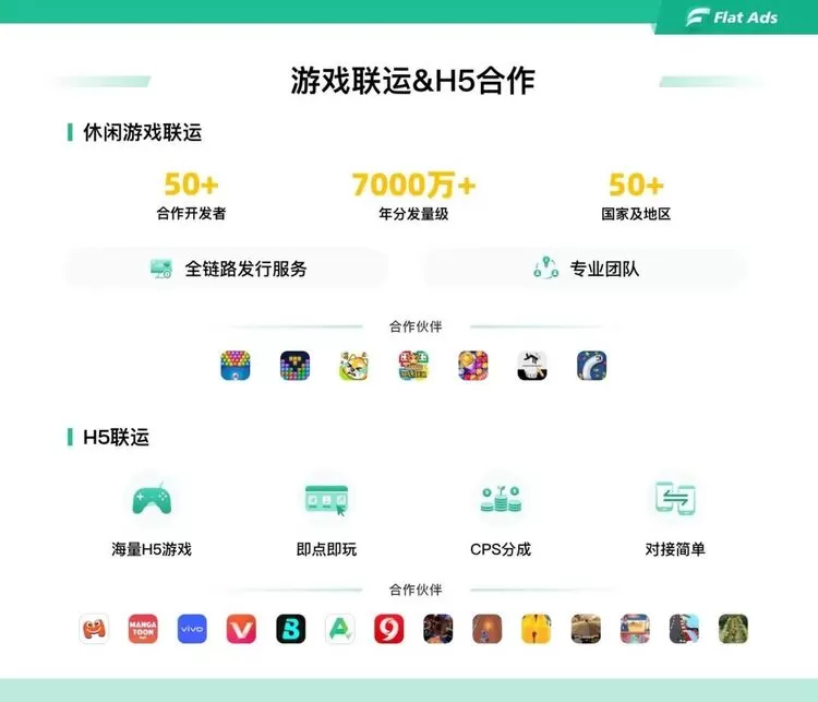 今天游戏开发者出海密度特别高,特别是首次出海的开发者们,对于平台能够给到的一站式服务和对接的简单性也有要求,前来洽谈的很多游戏客户也在陆续接入游戏联运和H5合作,并将Flat Ads作为出海整合营销的新选择。Flat Ads致力于为全球游戏开发者提供全方位、顶级的联运发行服务,共建游戏生态,助力商业成功。