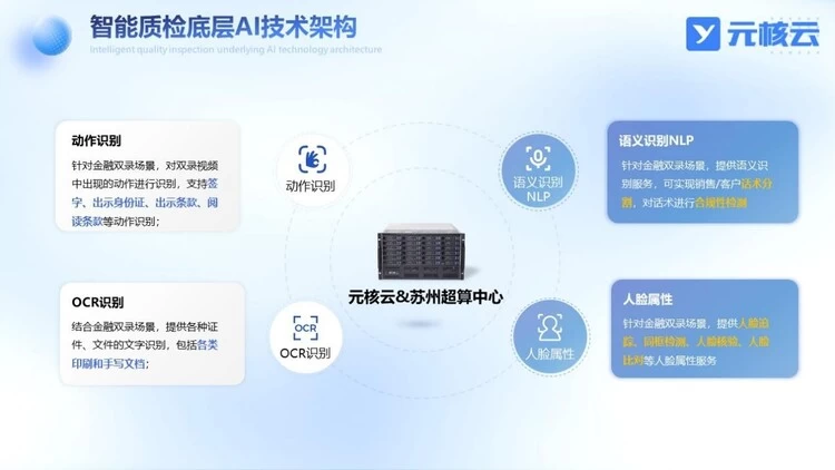 元核云依托AI技术打破人工质检桎梏,并与苏州超算中心深度合作,结合金融业务场景进行深度训练,提供了动作识别、语义识别、OCR识别和人脸属性等AI服务,与音视频技术高度融合,为金融视频质检业务打造更智能、更便捷、更高效的解决方案。