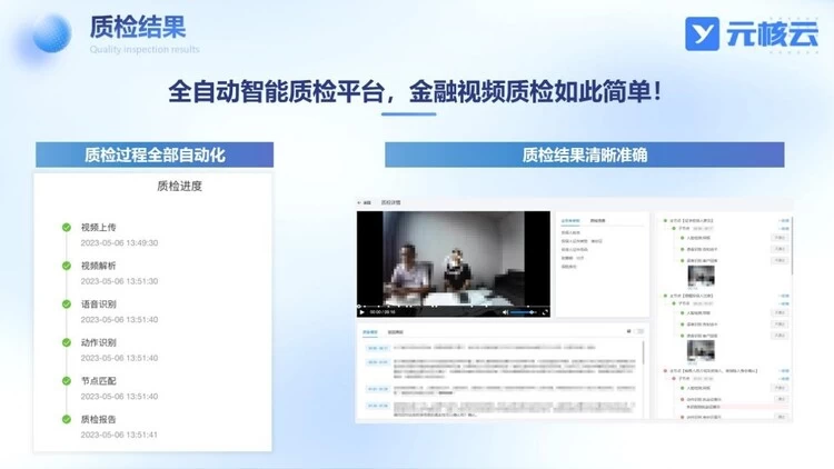 在多种AI能力的支持下,元核云智能质检系统可以对海量视频进行全自动、全方位的检测,包含违规句检测、客户回答判断、多人同框检测、人证核验、签字及阅读动作判断、角色一致性检测等质检关键业务环节,并在任务结束后输出详细的可视化质检报告,明确标出问题环节并快速定位到对应问题的时间点,帮助审核人员精准判断并及时处理异常情况。