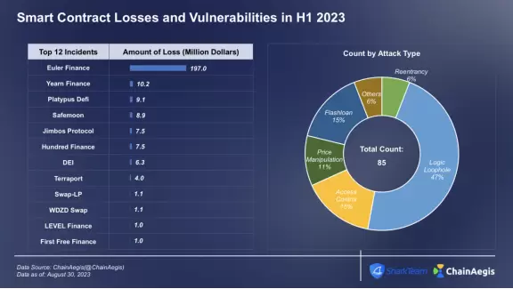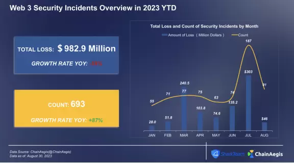 由于熊市影响,加密领域的资产总量降低,因安全问题产生的损失同比去年下降了59%。但这并不代表Web3领域的安全环境在变好,相反我们看到今年1月到8月,安全事件的数量达到693次,同比去年增加了87%,平均每个月有近90起安全事件,其中频率最高的是7月份,发生了187起安全事件。