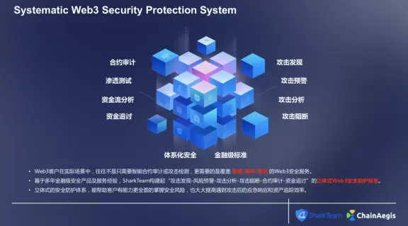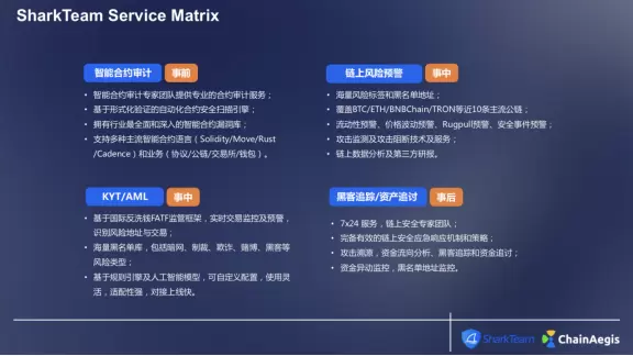SharkTeam的愿景是保护Web3世界的安全。团队由来自世界各地的经验丰富的安全专业人士和高级研究人员组成,精通区块链和智能合约底层理论。提供包括链上大数据分析、链上风险预警、智能合约审计、加密资产追讨等服务,并打造了链上大数据分析和风险预警平台ChainAegis,平台支持无限层级的深度图分析,能有效对抗Web3世界的高级持续性盗窃(Advanced Persistent Theft,APT)风险。