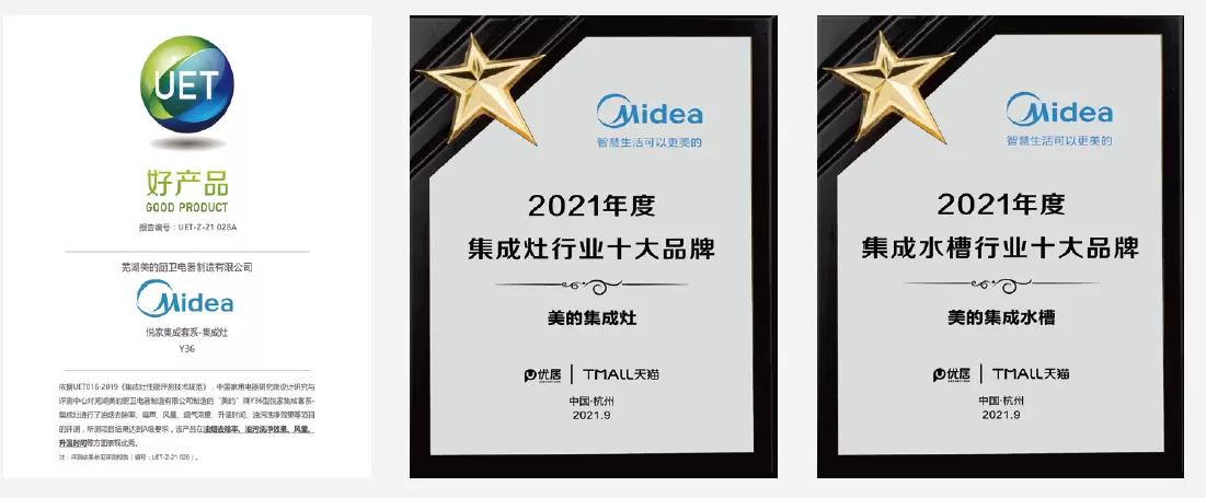 美的研发的集成灶产品屡次获得国内外大奖,美的集成灶和美的集成水槽分别在2021年斩获“2021年度集成灶行业十大品牌”和“集成水槽行业十大品牌” 殊荣。美的新一代大风压蒸汽洗集成灶Y36·悦厨集烟机、灶具、蒸箱、烤箱为一体,被中国家用电器研究院授予UET“好产品”证书及“集成灶领军品牌奖”。