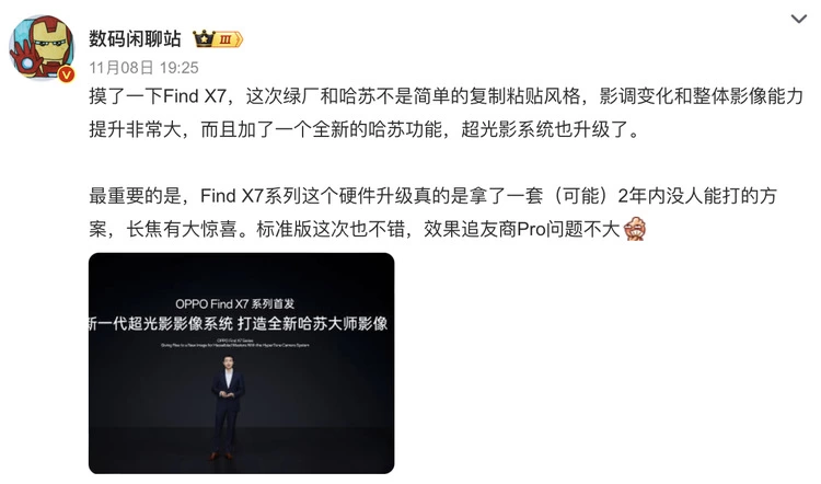 而前面提到的OPPO下一代影像旗舰,Find X7系列自然有着强劲的拍照性能,除了会搭载新一代超光影影像系统之外,还会提供前所未有的哈苏大师影像。并且大V数码闲聊站也爆料,这次OPPO和哈苏不是简单的复制粘贴风格,影调变化和整体影像能力提升非常大,还加了一个全新的哈苏功能,超光影系统同步升级了;也透露了Find X7系列有一套可能2年内没人能打的硬件方案,长焦表现有惊喜,可谓瞬间拉满了期待值。