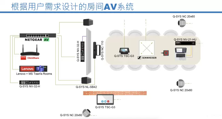 为了让嘉宾亲临其境感受高规格空间的魅力,现场精心构建一个以Q-SYS智能化音视频技术为核心的高规格空间,系统高度集成、自动化和易于操作,设备包括一台Q-SYS NV32网络视频编/解码器和一台Q-SYS NV21-HU,结合联想ThinkSmart系列智能协作主机,Microsoft Teams视频会议,森海塞尔TCC2吸顶麦克风,4个Q-SYS原生NC摄像头,Netgear路由器和Barco ClickShare等,即可轻松实现所有的音频、视频及控制和网络会议功能,通过简洁直观的Q-SYS TSC网络触屏控制器即可操作整个系统。