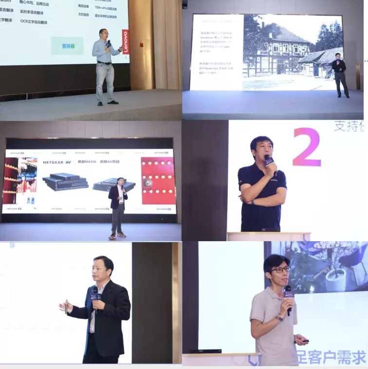 Q-SYS生态系统合作伙伴及授权代理商现场分享最新智能会议技术,发言嘉宾包括联想智能协作资深产品营销总监吴敏(左上)森海塞尔商务通讯北区销售经理赵旭(右上)Netgear亚太区ProAV设计顾问团队高级经理郭浩航(左中)巴可中国会议体验部门产品经理赵猛(右中)佳联公司技术总监王冷霜(左下)聚沣公司技术经理陈庆权(右下)。