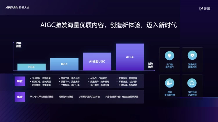 用户在任意设备及平台上享受统一且高质量的体验,并进行实时交互与协作,开发者高效创作内容和分发,这些都离不开云原生能力。刘昊辰强调,云原生是从一开始就为云环境设计和构建的应用,它能够充分利用云计算的强大功能,为用户提供前所未有的体验。在场景层面,云原生提供包括多平台无缝接入、实时交互与协作、高效内容创作与分发等能力;在技术层面,云原生为内容提供强大的云端计算和存储、先进的音视频串流和丰富的开发与运营工具等。在过去2年中,元境在云原生技术上不断探索和在应用场景上做深度投入,打磨支持云原生的底层架构,并基于实时云渲染技术,结合生成式AI的能力,为元宇宙创造云原生的全新玩法和创作平台,推动云原生应用更快落地,为数字产业的发展打开新的可能。