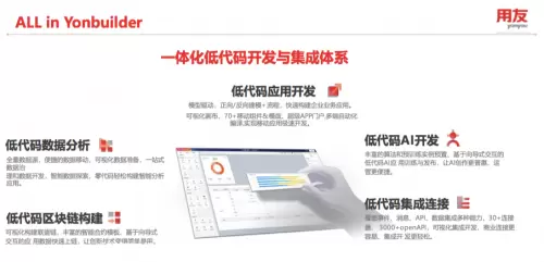 其次,YonBuilder不仅仅是一个低代码开发平台,它还被打造成低代码开发与集成家族,包括低代码应用开发、低代码数据分析、低代码AI开发、低代码区块链构建和低代码集成连接。这一创新融合了用友各方面的产品能力,如应用测试由用友RPA机器人完成,数据实时分析变化。最后YonBuilder支持企业级和个人级开发,全角色开发,满足IT人员和业务人员的需求,实现全场景开发。