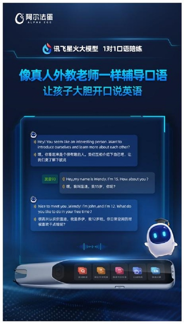 以最近销量位居榜首的阿尔法蛋AI词典笔T20为例,其搭载讯飞星火认知大模型上线口语陪练功能,就像一个24小时在线的一对一“口语外教”,孩子应用这项功能进行口语对练,标准发音听得见,随时随地置身“英语角”,口语高效提升,效果看得见。