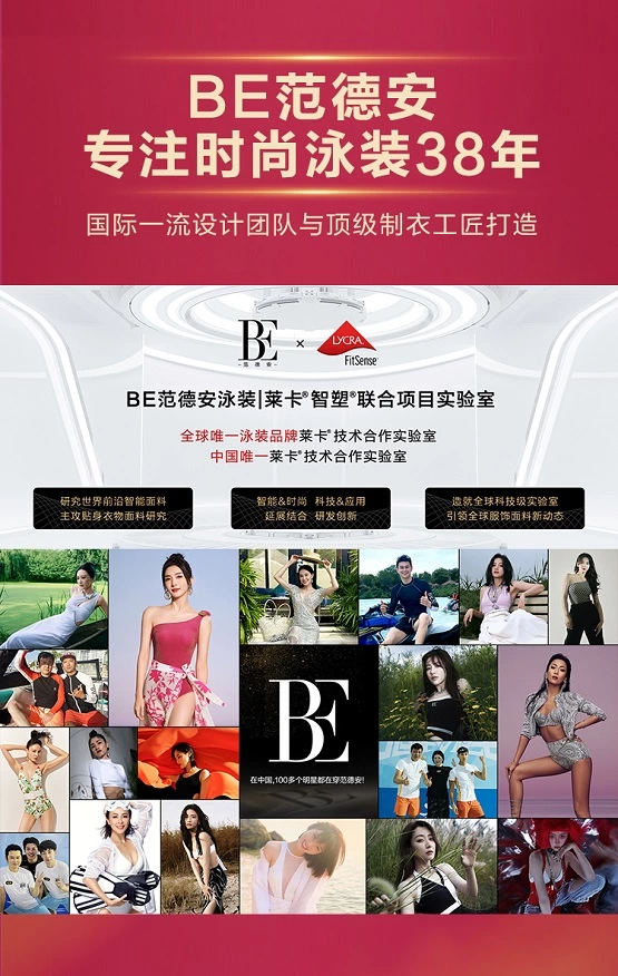 BE范德安专注高端时尚泳装38年,是众多明星青睐的时尚泳装。在中国,100多个明星都在穿范德安,包括杨幂、刘嘉玲、赵丽颖、吉克隽逸等当红明星,都自发选择BE范德安时尚泳装,展现魅力风姿!