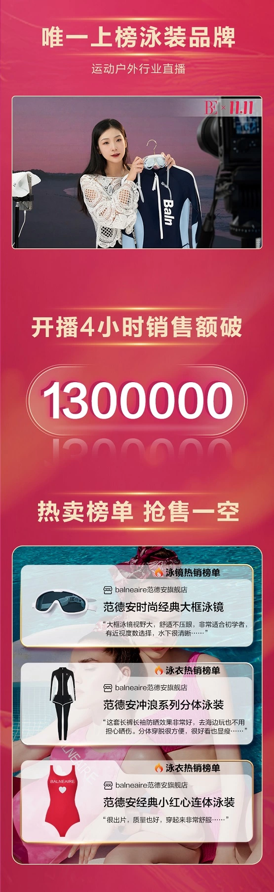 在“双11”这场大考中,既考验品牌在节点的爆发力,也考验企业长久发展的能力,而BE范德安以惊人的爆发力、品牌力和产品力,精准布局,在这场战役中成功卫冕,巩固了全球高端时尚泳装领导品牌的地位!
