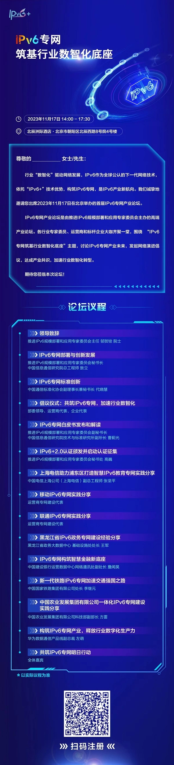 2023年11月17日,由推进IPv6规模部署和应用专家委员会主办的“IPv6专网产业论坛”将在北京召开,本次论坛以“IPv6专网,筑基行业数智化底座”为主题。