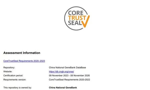 2023年11月9日,国家基因库生命大数据平台(CNGBdb)获得CoreTrustSeal全球核心可信存储库国际认证。CoreTrustSeal全球核心可信存储库国际认证是由国际科学理事会数据批准印章(Data Seal of Approval,DSA)和世界数据系统(World Data System,WDS)联合推动的全球核心可信存储库国际认证。截至目前,CNGBdb是生命科学领域国内首个通过该国际认证的数据仓储。