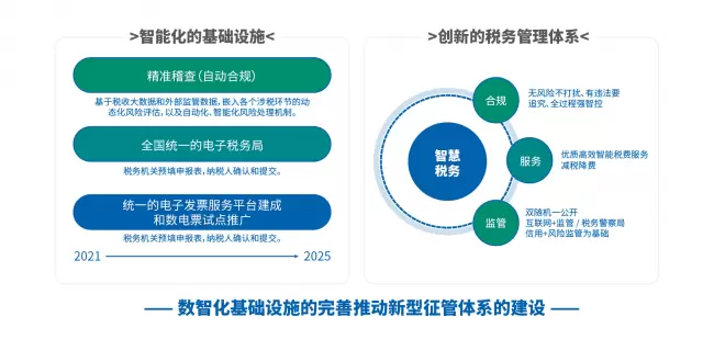另外,在合规方面,智慧税务的核心,是利用数智化基础设施的完善,推进新型征管体系建设,其中,无风险不打扰、以信用+风险监管为基础、提供优质高效智能税费服务是长期建设目标。