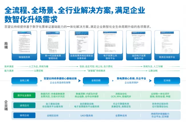 针对企业需要快速上线乐企平台实现数电票应用的需求,百望云与华为联合发布数字化创新解决方案,基于强大的华为云基础设施底座,整合百望云面向企业财税合规的票、财、税、链一体化的企业数字化核心能力,为金融行业客户提供数电乐企一体化产品和服务,在满足数电票的开票、归集、查验、抵扣勾选、退税勾选、代办勾选和入账等需求的同时,亦可贯穿票、财、税、链全流程的自动化,推动企业数字化快速发展。