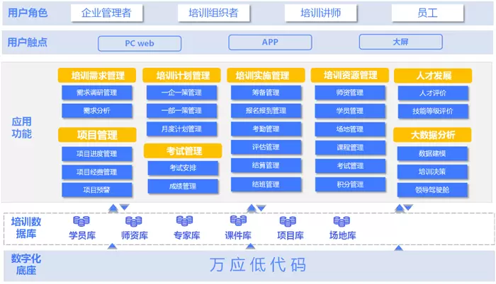 该企业基于万应低代码,利用【连接器】实现业务平台的互联互通,结合【数据中台】的能力,实现培训管理平台业务数据汇集,沉淀培训“六库”:员工库、师资库、场地库、课件库、项目库、人才库。