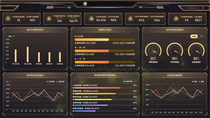 ·培训数据统计分析。基于平台沉淀的培训全流程数据、培训资源等基础数据,与在线网络学习平台、ERP财务系统、项目中台等实现互联互通,自动生成公司培训情况对比分析、全年办班统计、经费执行情况统计、全年培训满意率等全局化数据视图,辅助管理层实时管控公司的培训、资金、资源等进展情况,为管理层监督决策提供有效依据。