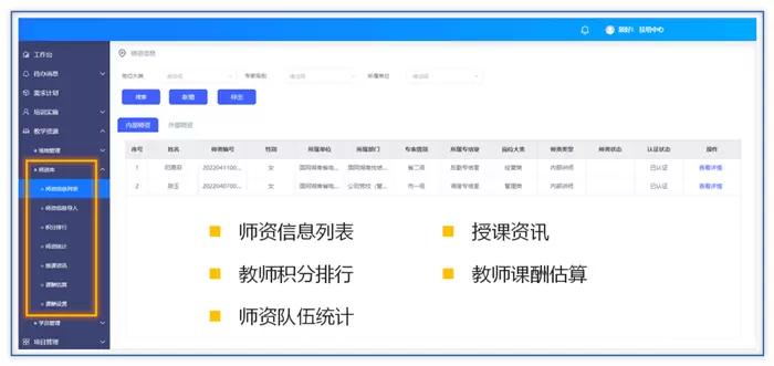 ·培训数据库-师资库。通过建设师资信息台账、师资工作量统计、教师课酬估算等模块,沉淀师资库,实现师资筹备全过程可视化、师资基础档案规范化、绩效、评优等工作有据可查。