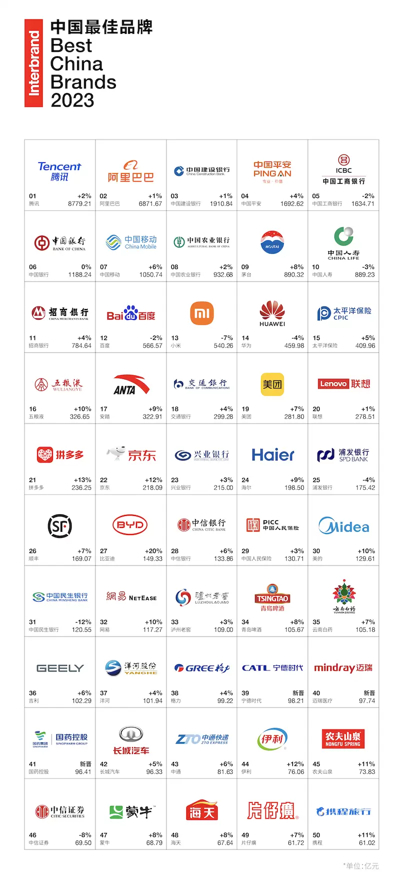 11月13日,全球性品牌战略管理咨询与设计公司Interbrand英图博略发布《2023中国最佳品牌排行榜》,上榜品牌总价值达33676.7亿元,近八成企业的品牌价值实现稳中有升。其中,腾讯、阿里巴巴和中国建设银行分别以8779.21亿元、6871.67亿元和1910.84亿元位列前三甲。