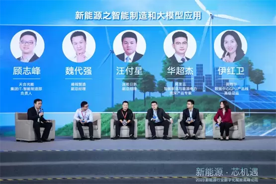 在论坛的圆桌讨论环节,维视智造负责人魏代强与天合光能集团IT-智能制造部负责人顾志峰、国能日新副总经理汪付星、阿里云智能制造与能源电力资深产品专家华超杰、英特尔数据中心GPU产品线高级总监伊红卫等嘉宾以“新能源之智能制造和大模型应用”为主题展开讨论,分享了企业在数字化转型与创新的落地路径、大模型之下人工智能的落地模式等方面的多类变革。