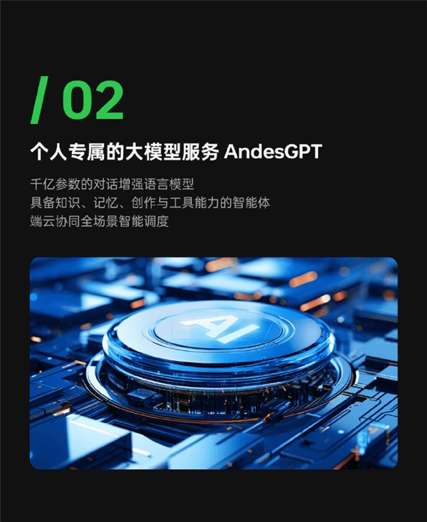 即将发布的AndesGPT突出了三个层面的标签:“千亿参数的对话增强语言模型”“具备知识、记忆、创作与工具能力的智能体”“端云协同全场景智能调度”。