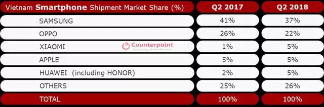 北京时间8月10日下午消息 主要得益于中国品牌的新产品推出,根据Counterpoint Research的数据,越南智能手机市场在(2018年)第二季度恢复了两位数的增长。