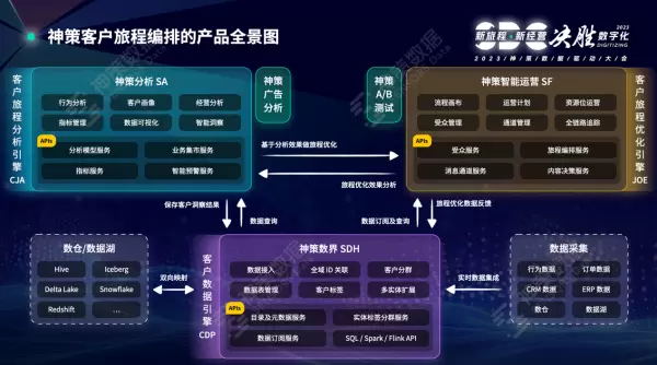 处于产品架构底层的是客户数据引擎(CDP),支持包括行为数据在内的各类数据的导入,也支持与企业已有数据湖数仓的双向映射,在这个基础上,进行数据的 ETL 和建模;基于更强能力的全新 CDP 底座,面向用户行为的分析引擎进化成了全新的客户旅程分析引擎(CJA);神策智能运营则升级为客户旅程优化引擎(JOE)。