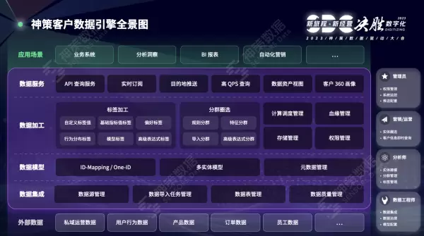 曹犟提到,过去八年多,神策数据累计服务了 30 多个行业的 2000+ 企业,并基于企业的个性化需求和对数字化经营的价值期望,总结确定了三大引擎的业务价值,进而完成了整体的产品架构设计。