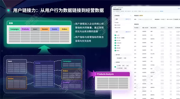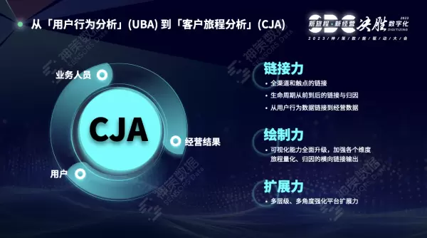 在此背景下,CJA 本质上就是要帮助企业把自己的用户、业务人员以及经营结果进行有效的链接,环环相扣,实现 1+1+1 的紧密联合,提升核心业务价值。因此,CJA 在原有用户行为分析的基础上,围绕用户链接力、数据绘制能力、平台扩展力三个方面做了进一步的升级。