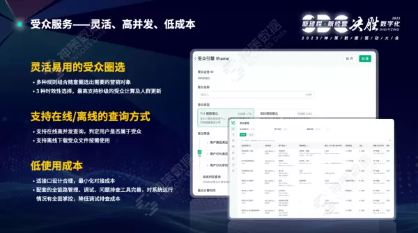 受众服务的底层能力同样是神策 CDP,为企业提供人群圈选的组件及接口,可以方便灵活地植入企业自身的业务系统,帮助企业实现低成本的受众圈选,并可支持离线、在线的查询方式。其中,在线查询能够支持企业的高并发诉求。